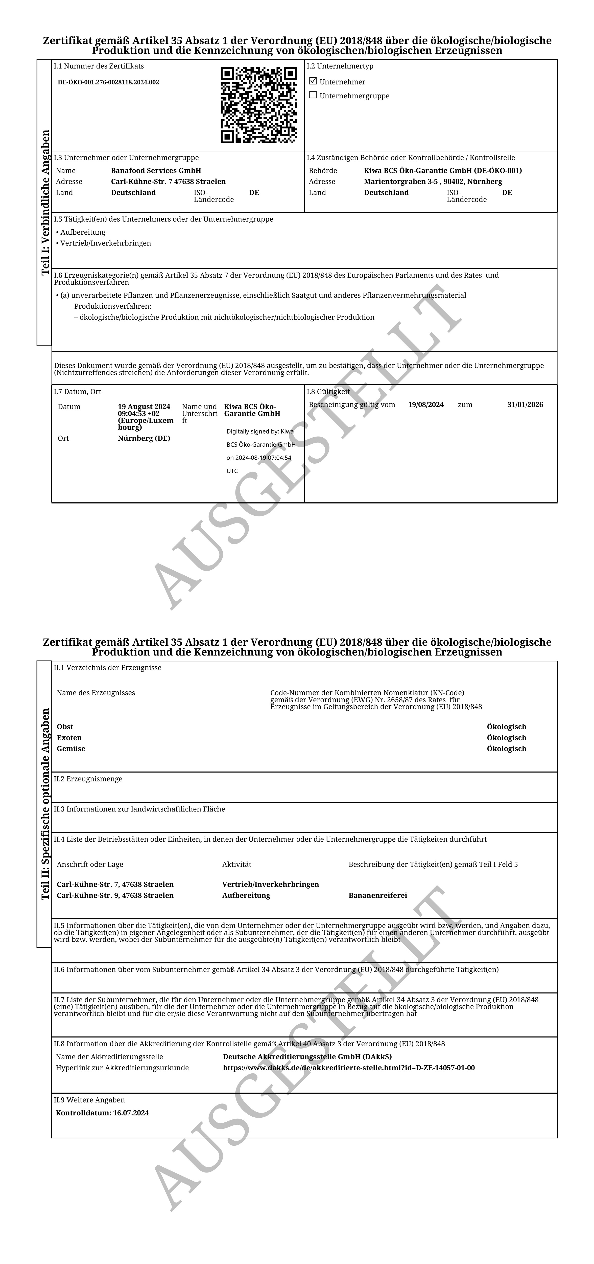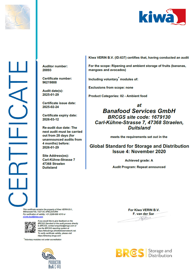 Banafood Services GmbH is zowel BRC als BCS-bio gecertificeerd.